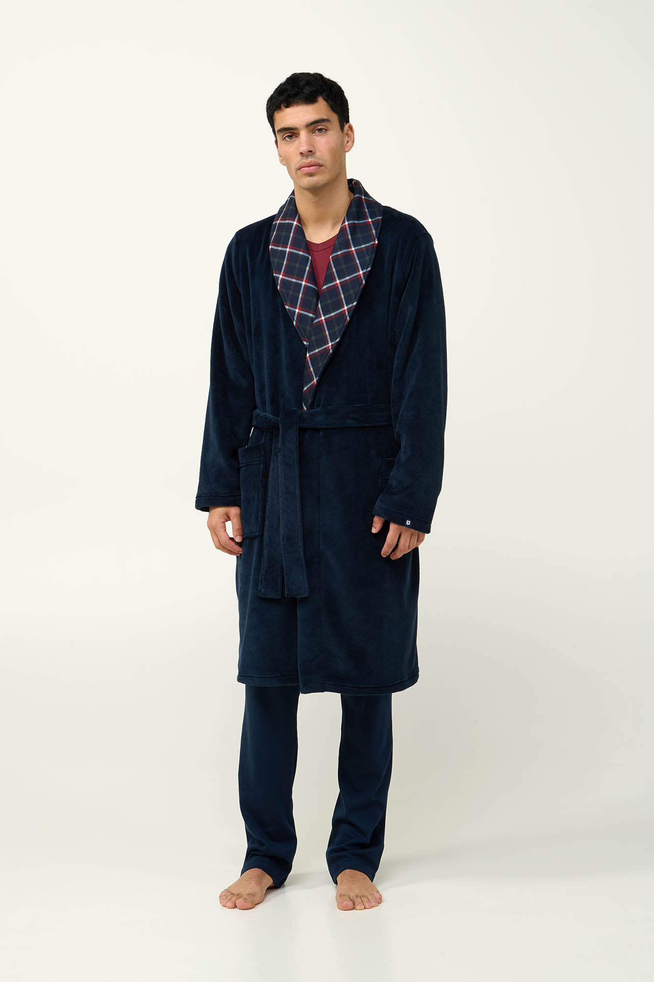 Halat lung bărbătesc din fleece bleumarin, moale și călduros, cu guler șal elegant și garnitură ecosez