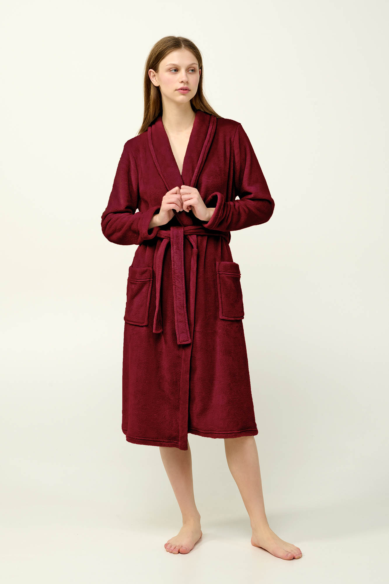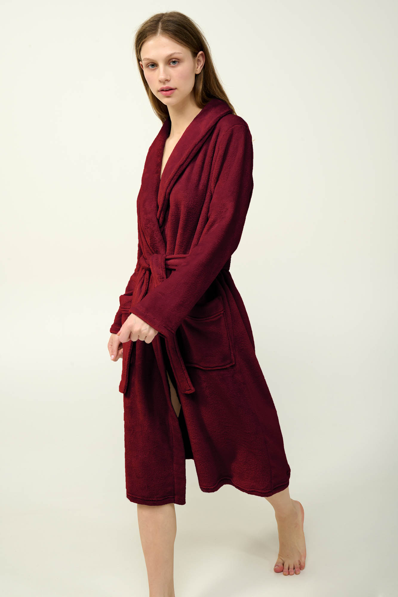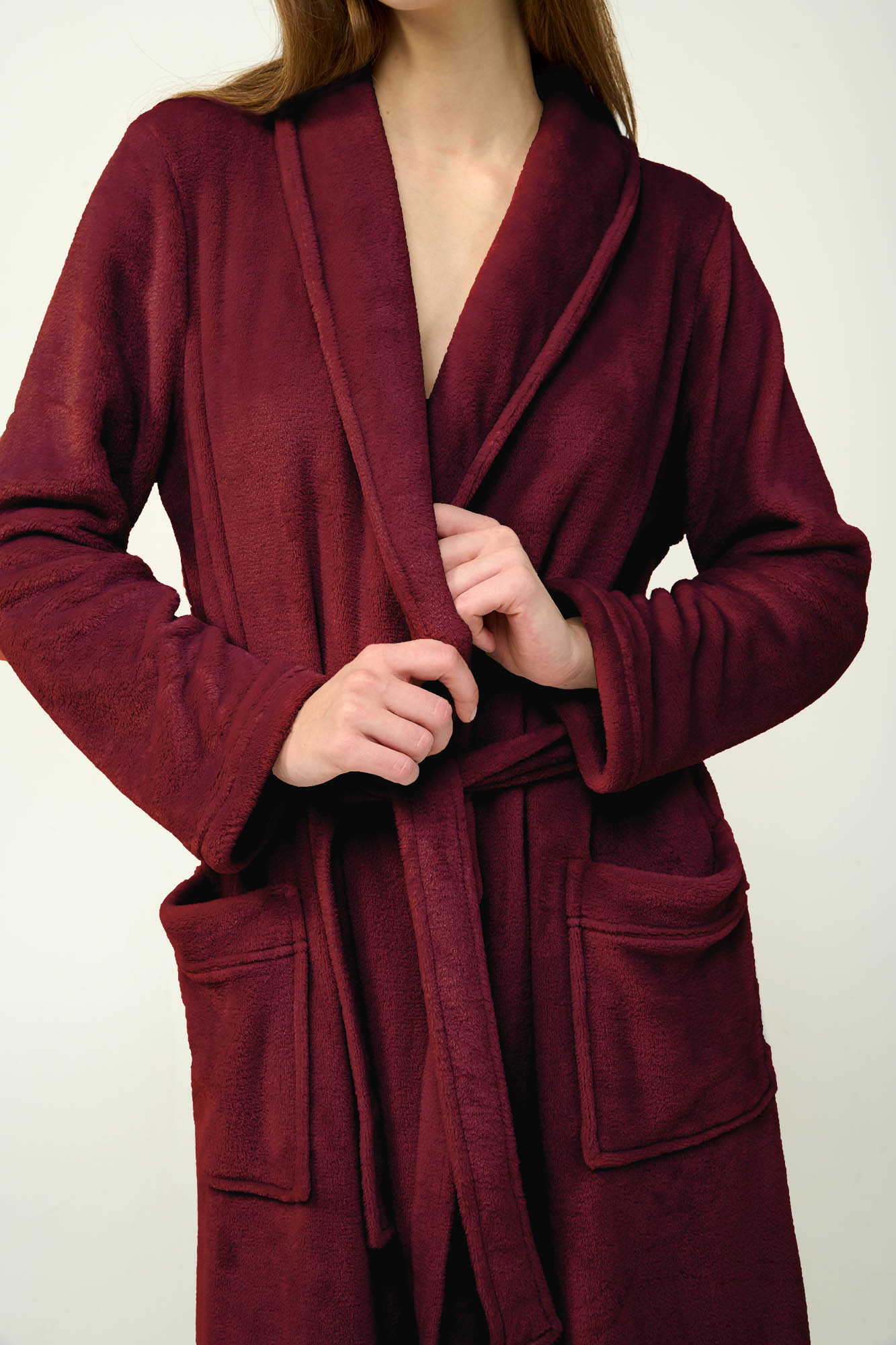 Halat lung pentru femei – confort și căldură de neegalat. Acest halat lung este fabricat din fleece bordo, un material moale și extrem de călduros, perfect pentru sezonul rece. Designul elegant include un guler tip șal care oferă un plus de rafinament, iar cordonul în talie permite ajustarea pentru o siluetă feminină. Halatul are buzunare frontale practice si incapatoare.