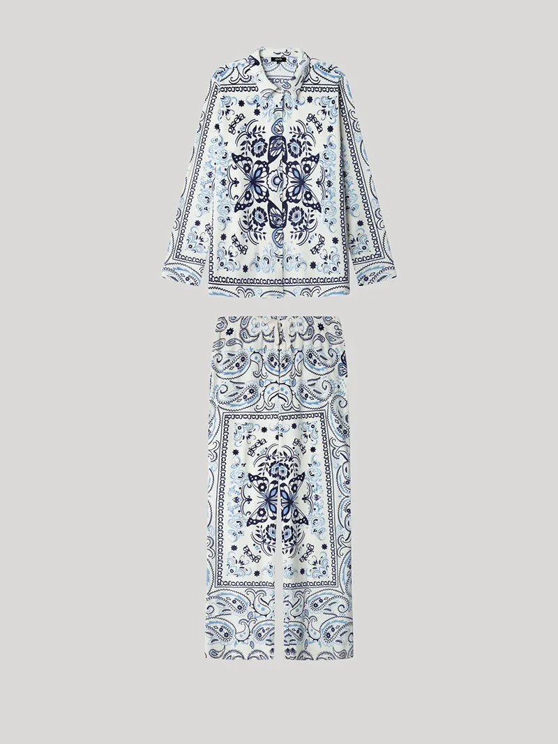 Imprimeul delicat cu fluturi albaștri pe fond alb adaugă un aer vesel și feminin, transformând această pijama într-o alegere ideală pentru nopți liniștite și confort maxim.