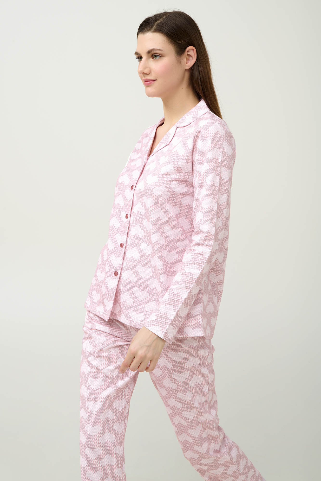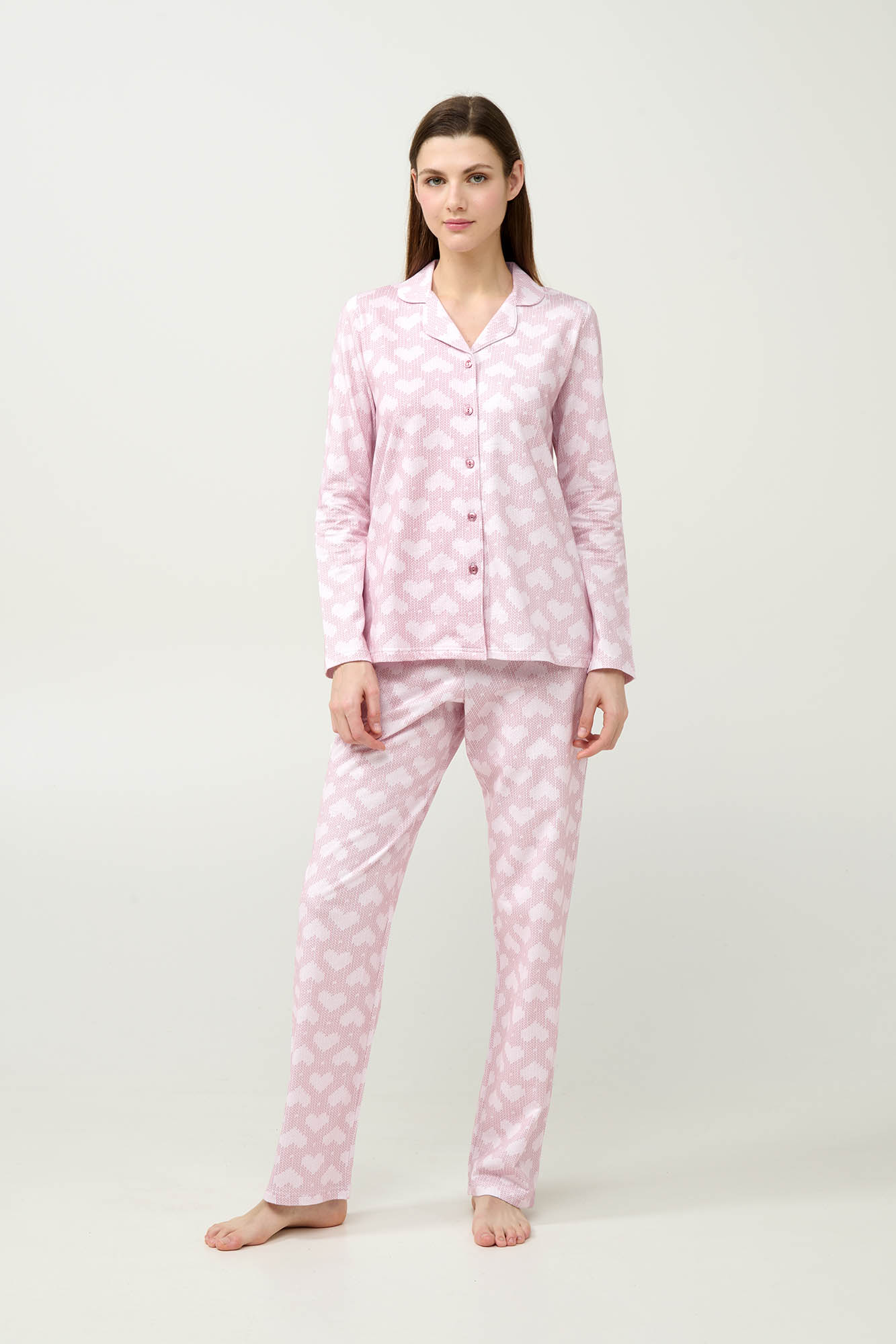 Pijama damă clasică din bumbac vătuit – roz cu inimioare.