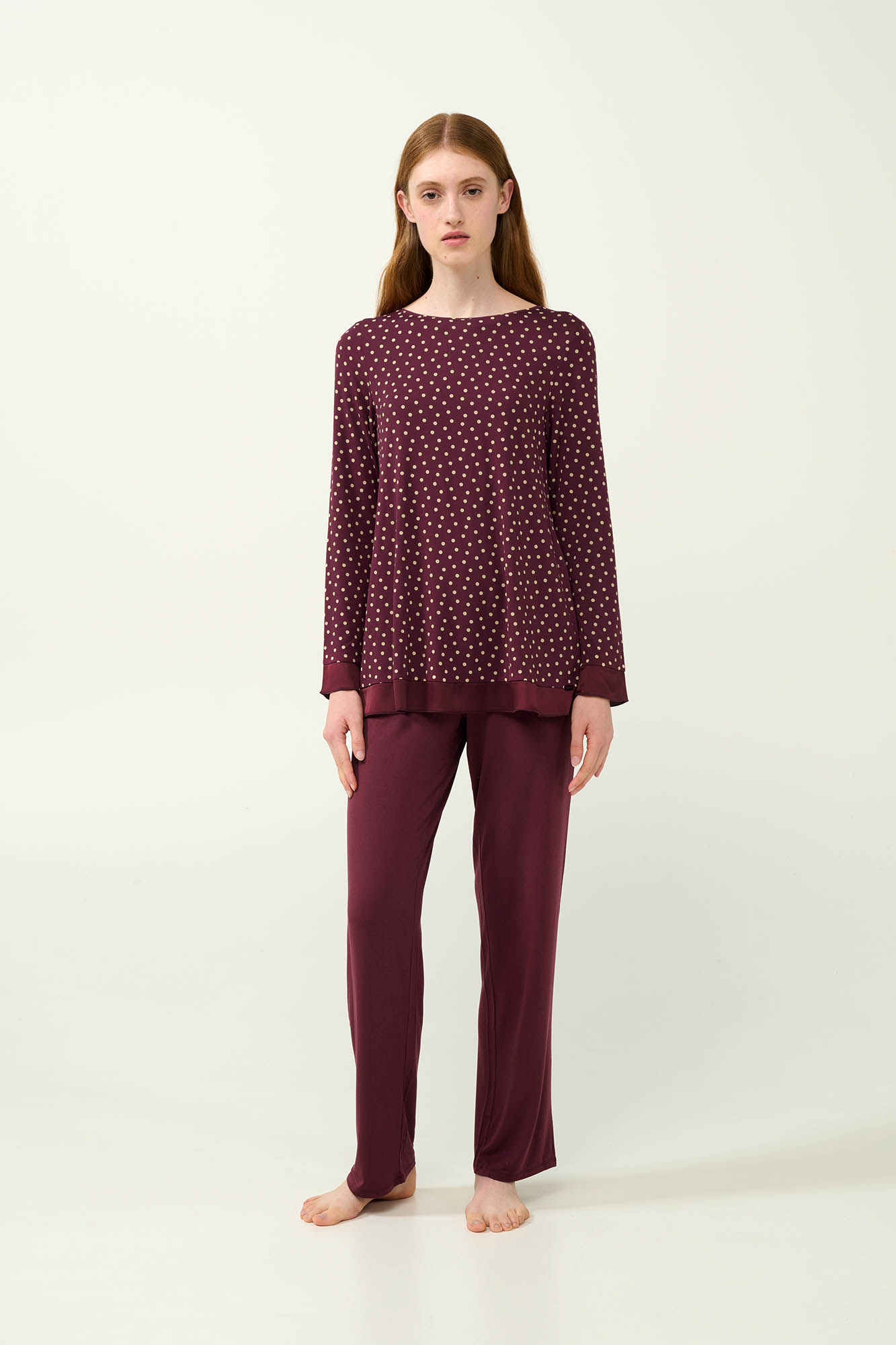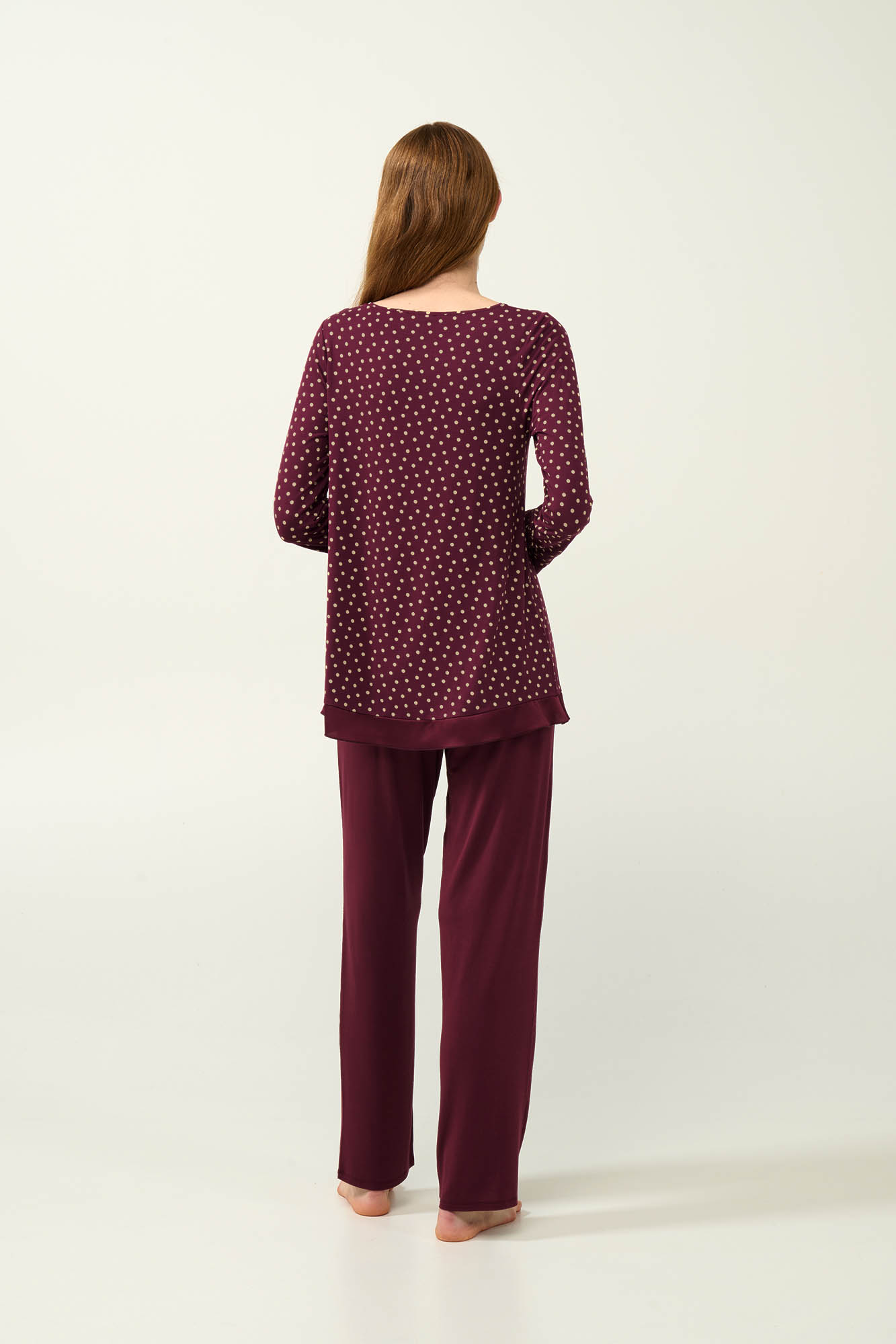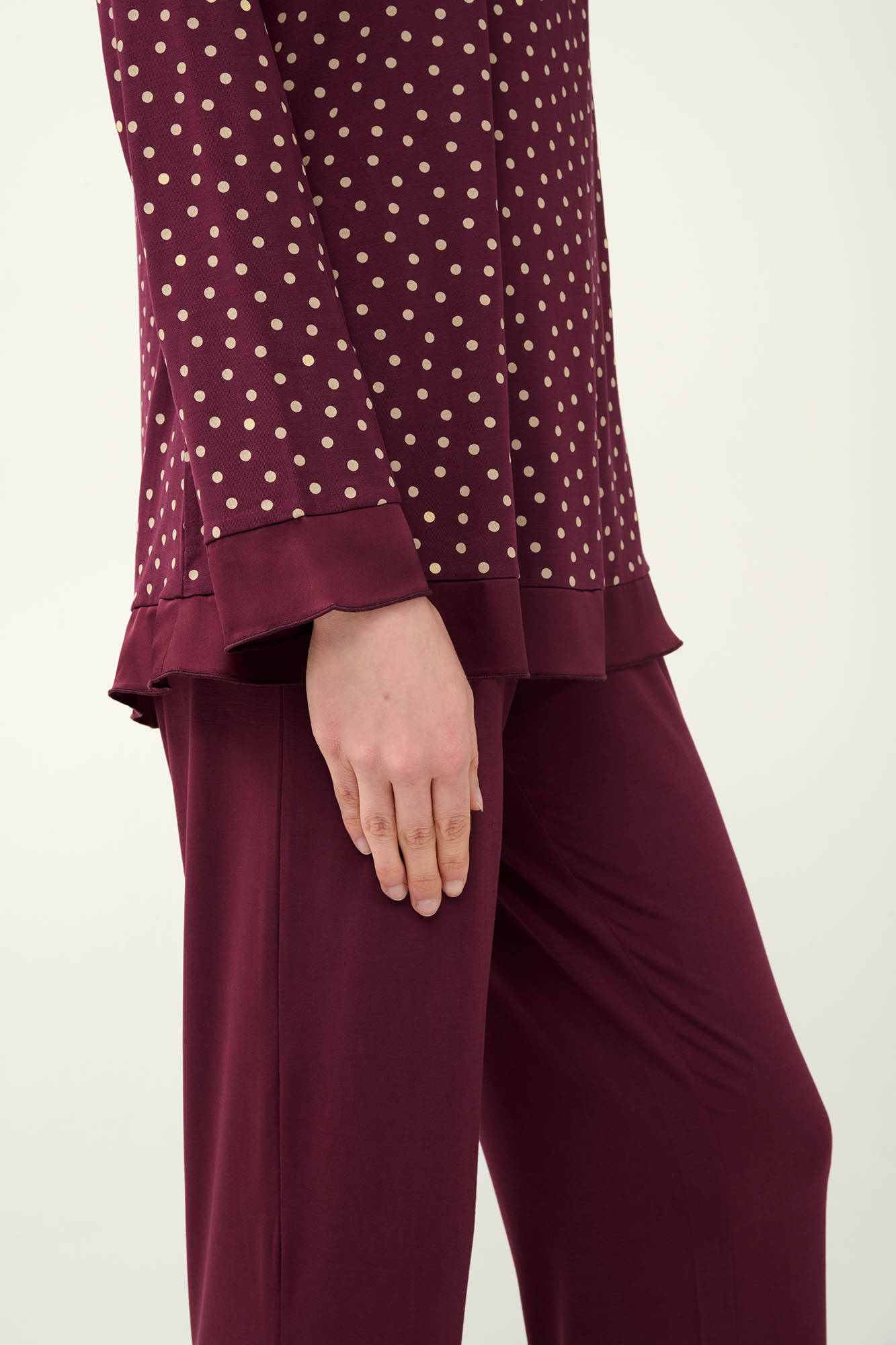 Pijama damă din micromodal , bluza bordo cu buline bej și detalii satinate, pantaloni clasici bordo uni cu talie elastica.