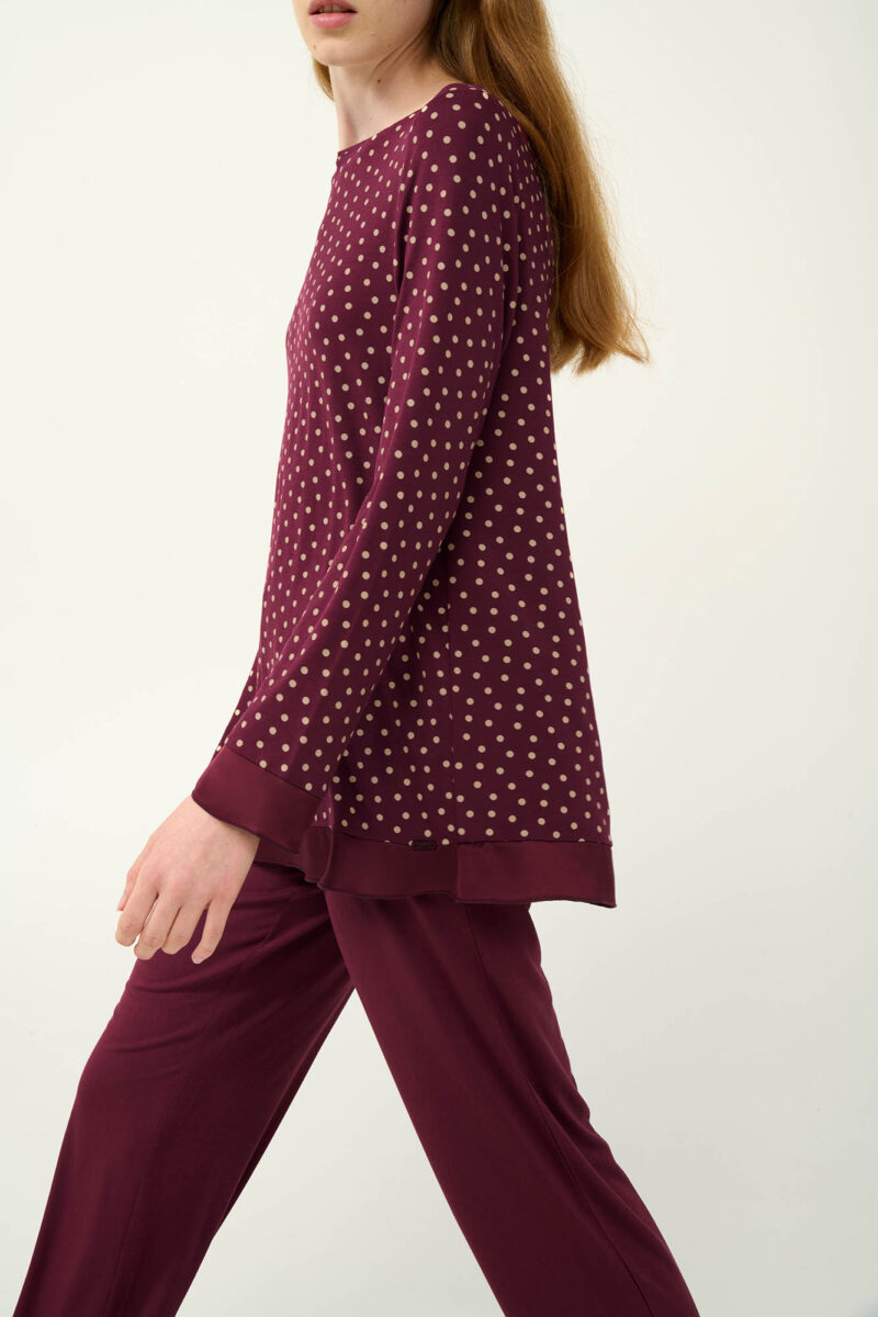 Bluza: decolteu rotunjit la baza gâtului, imprimeu bordo cu buline bej, detalii satinate la mâneci și tiv