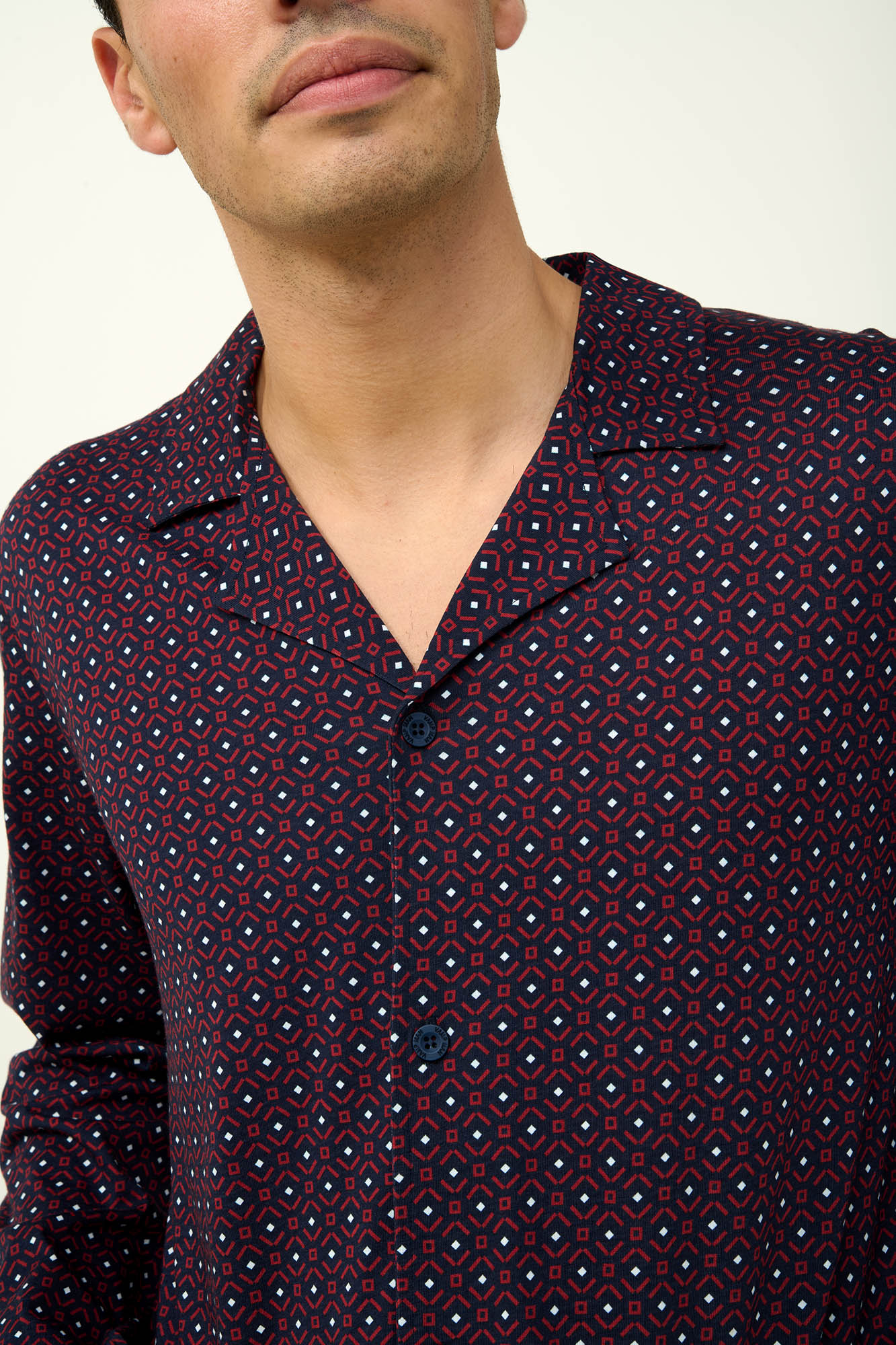 Pijama clasică pentru bărbați, realizată din bumbac de calitate, ce oferă confort și respirabilitate. Bluza are croială tradițională cu revere, se deschide cu nasturi pe toată lungimea și este prevăzută cu buzunare practice. Imprimeul discret adaugă un plus de stil, păstrând în același timp un aspect elegant și rafinat.